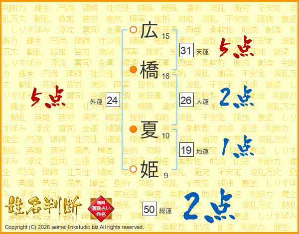 広(15画)橋(16画) 夏(10画)姫(9画)