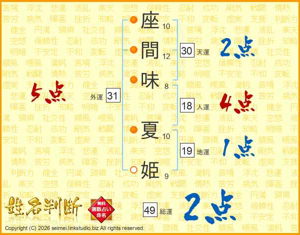 座間味夏姫さんの総運は49画の2点!