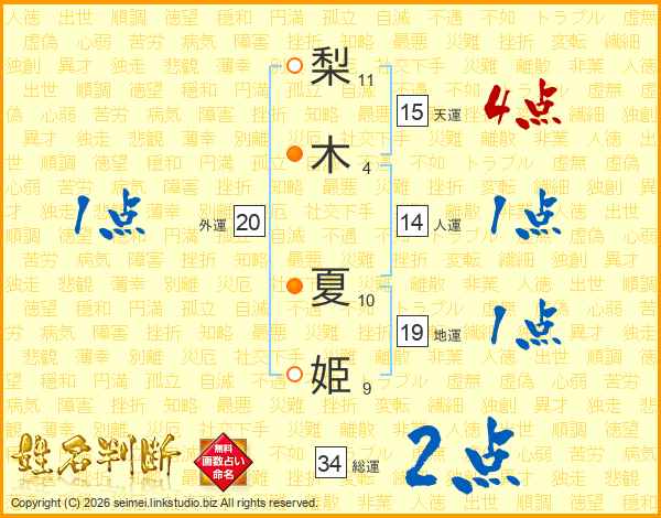 梨(11画)木(4画) 夏(10画)姫(9画)