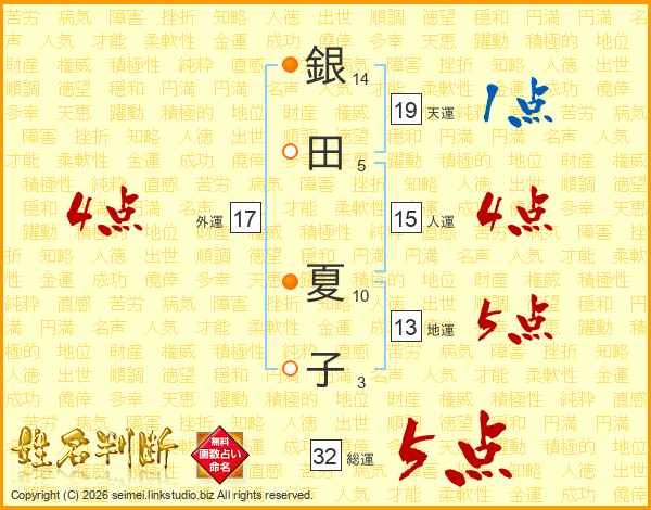 生活面を象徴する運勢です。外部から受ける影響力を表し、結婚運、家庭運や職場、環境への順応性を表します。総運から人運を引いた画数。姓や名が1文字の場合を除く。