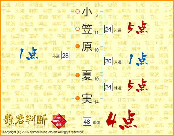 小(3画)笠(11画)原(10画) 夏(10画)実(14画)