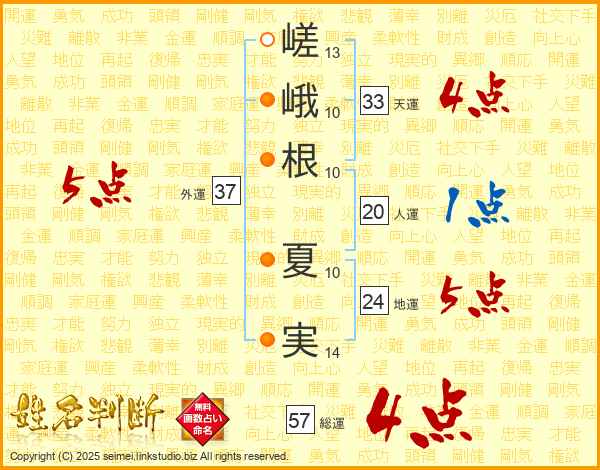 嵯(13画)峨(10画)根(10画) 夏(10画)実(14画)
