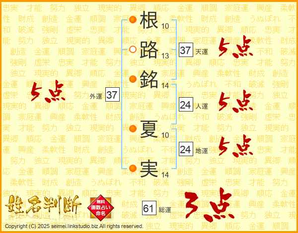 根(10画)路(13画)銘(14画) 夏(10画)実(14画)
