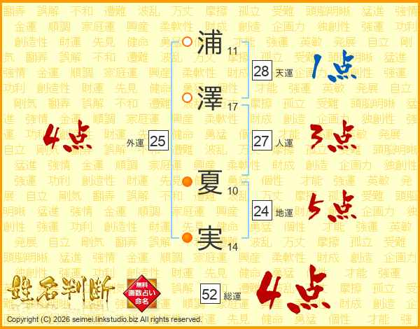 浦(11画)澤(17画) 夏(10画)実(14画)