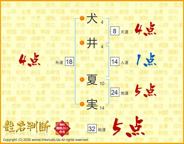 犬(4画)井(4画) 夏(10画)実(14画)