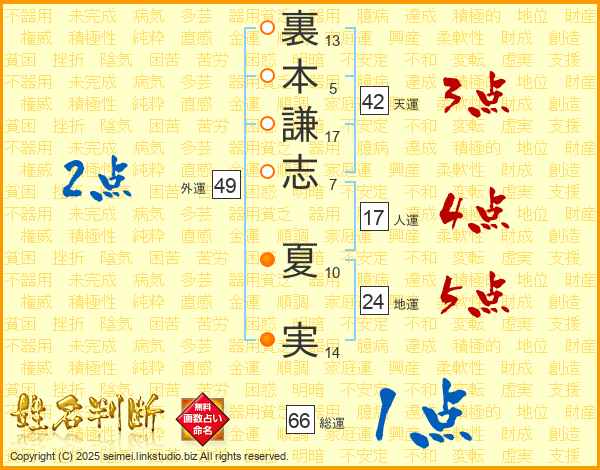 裏(13画)本(5画)謙(17画)志(7画) 夏(10画)実(14画)
