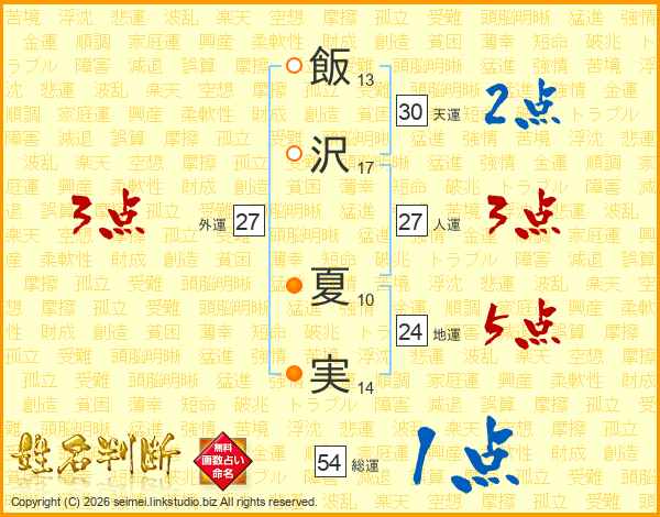 飯(13画)沢(17画) 夏(10画)実(14画)