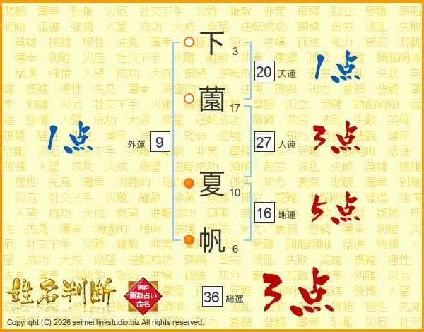 下(3画)薗(17画) 夏(10画)帆(6画)