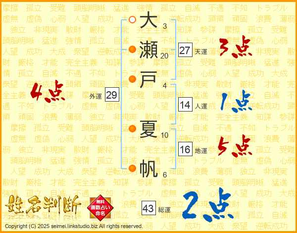 大瀬戸夏帆さんの総運は43画の2点!