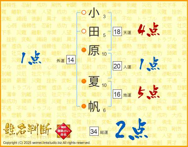 小(3画)田(5画)原(10画) 夏(10画)帆(6画)