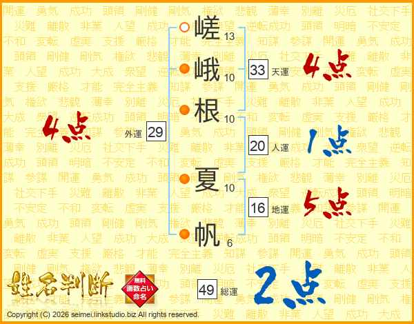 嵯(13画)峨(10画)根(10画) 夏(10画)帆(6画)