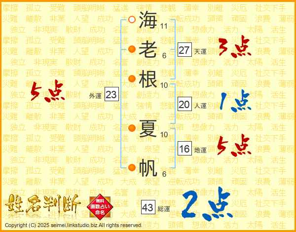 海(11画)老(6画)根(10画) 夏(10画)帆(6画)