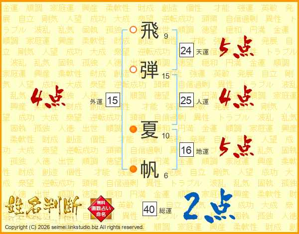 飛(9画)弾(15画) 夏(10画)帆(6画)