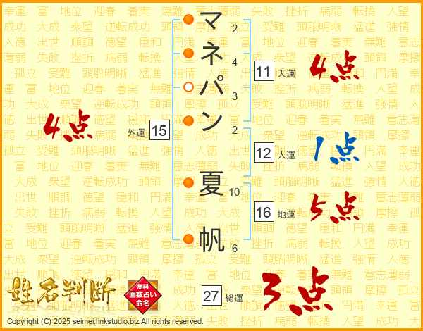 マ(2画)ネ(4画)パ(3画)ン(2画)  夏(10画)帆(6画)