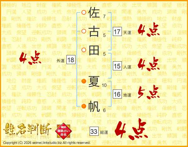 佐古田夏帆さんの総運は33画の4点!