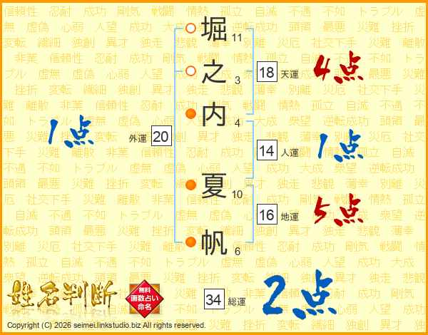 堀(11画)之(3画)内(4画) 夏(10画)帆(6画)