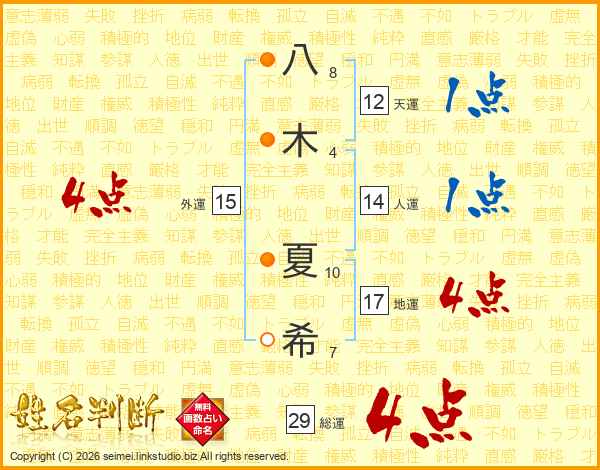 画数の奇数(○陽)と偶数(●陰)の配列で吉凶を占います。どちらかにかたよる名前は大凶名で避ける必要があります。画数の奇数偶数。