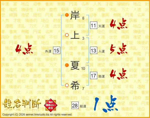 生活面を象徴する運勢です。外部から受ける影響力を表し、結婚運、家庭運や職場、環境への順応性を表します。総運から人運を引いた画数。姓や名が1文字の場合を除く。