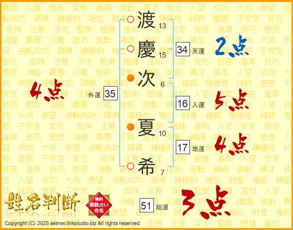 渡(13画)慶(15画)次(6画) 夏(10画)希(7画)