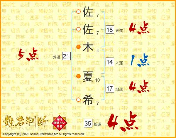 佐(7画)佐(7画)木(4画) 夏(10画)希(7画)