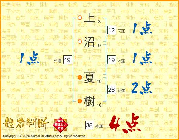 上沼夏樹さんの総運は38画の4点!