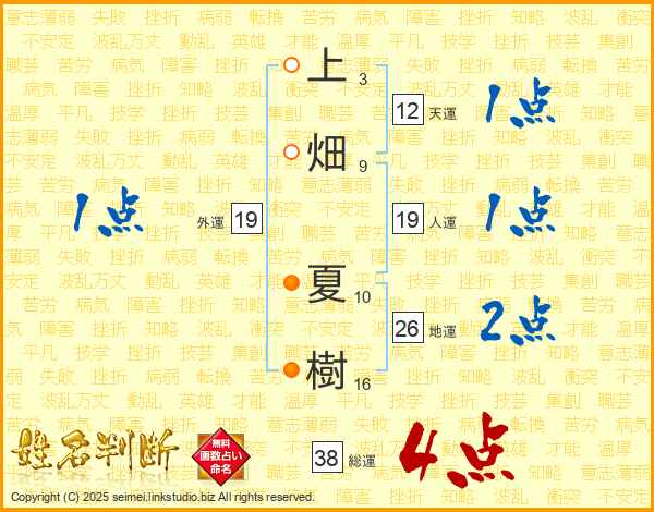 上(3画)畑(9画) 夏(10画)樹(16画)