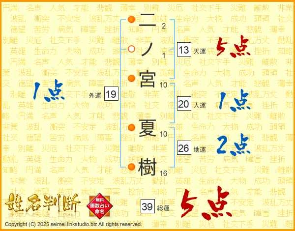 二ノ宮夏樹さんの総運は39画の5点!