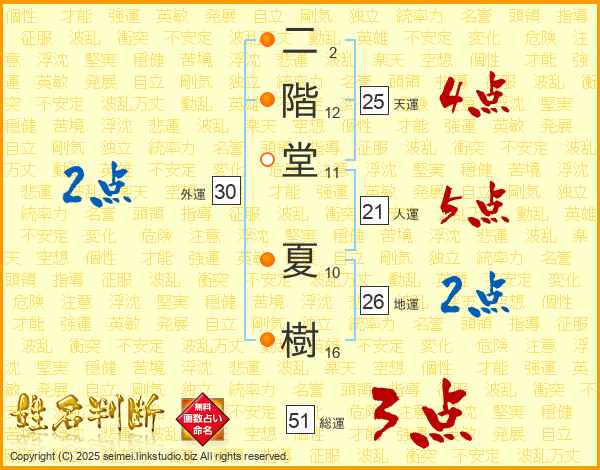 二(2画)階(12画)堂(11画) 夏(10画)樹(16画)