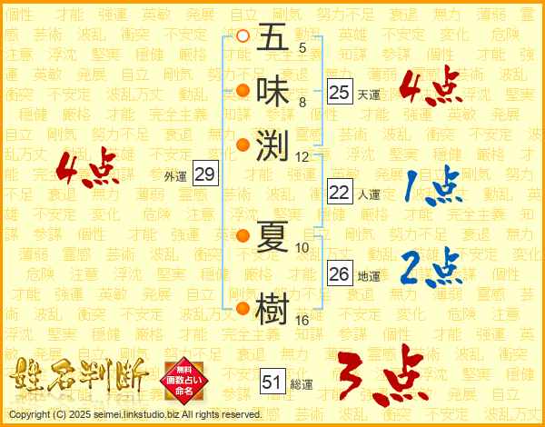 五(5画)味(8画)渕(12画) 夏(10画)樹(16画)