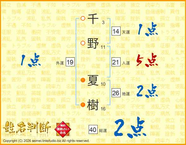 生活面を象徴する運勢です。外部から受ける影響力を表し、結婚運、家庭運や職場、環境への順応性を表します。総運から人運を引いた画数。姓や名が1文字の場合を除く。