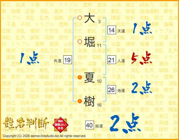 大(3画)堀(11画) 夏(10画)樹(16画)