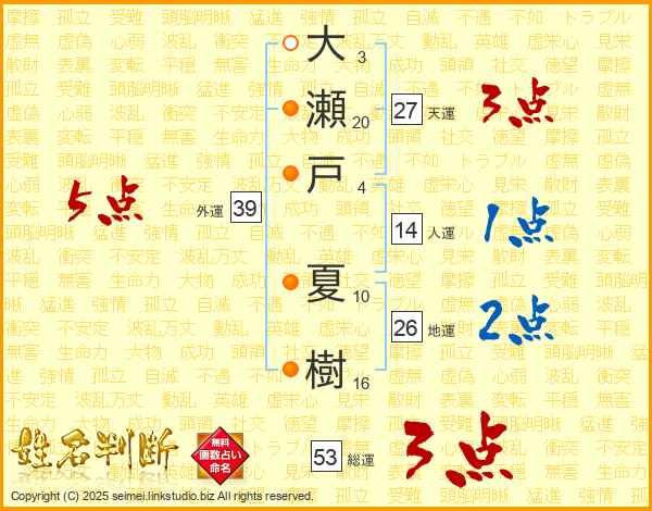 大(3画)瀬(20画)戸(4画)  夏(10画)樹(16画)