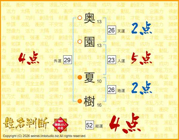 奥(13画)園(13画) 夏(10画)樹(16画)