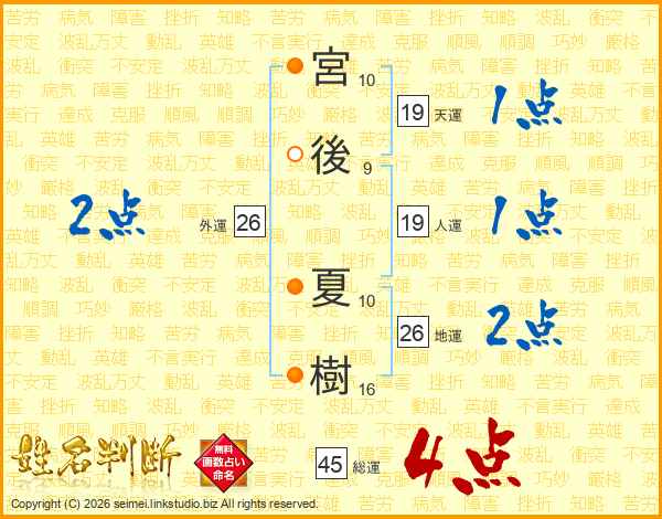 宮(10画)後(9画) 夏(10画)樹(16画)