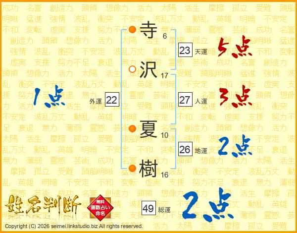 寺(6画)沢(17画) 夏(10画)樹(16画)