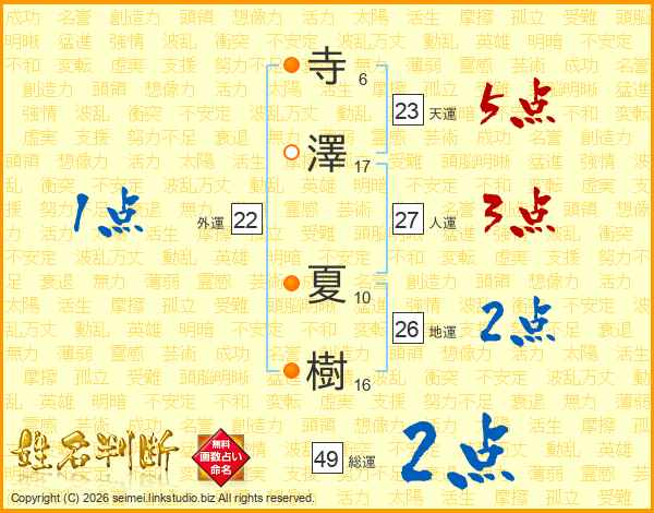 寺(6画)澤(17画) 夏(10画)樹(16画)