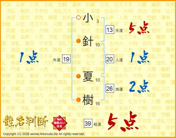 生活面を象徴する運勢です。外部から受ける影響力を表し、結婚運、家庭運や職場、環境への順応性を表します。総運から人運を引いた画数。姓や名が1文字の場合を除く。
