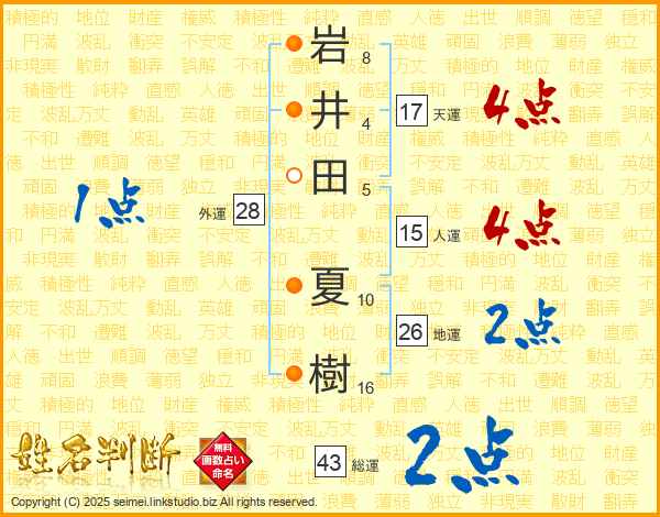 岩(8画)井(4画)田(5画) 夏(10画)樹(16画)