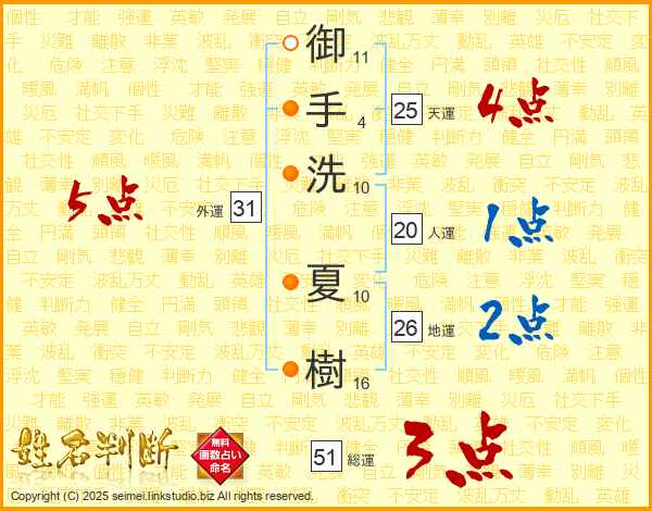 御(11画)手(4画)洗(10画) 夏(10画)樹(16画)