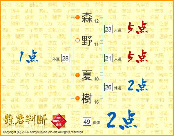 森(12画)野(11画) 夏(10画)樹(16画)
