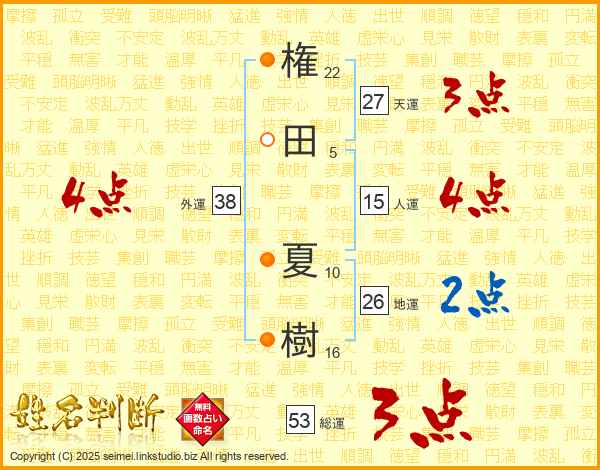 生活面を象徴する運勢です。外部から受ける影響力を表し、結婚運、家庭運や職場、環境への順応性を表します。総運から人運を引いた画数。姓や名が1文字の場合を除く。