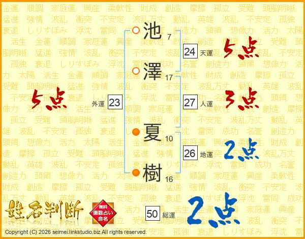 池(7画)澤(17画) 夏(10画)樹(16画)