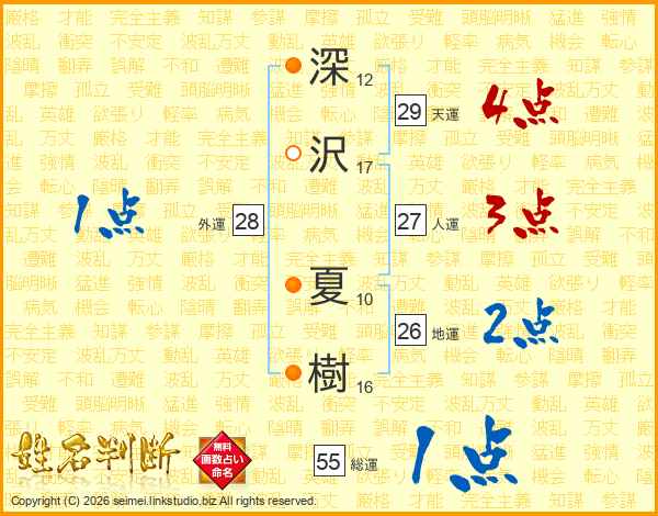 深(12画)沢(17画) 夏(10画)樹(16画)