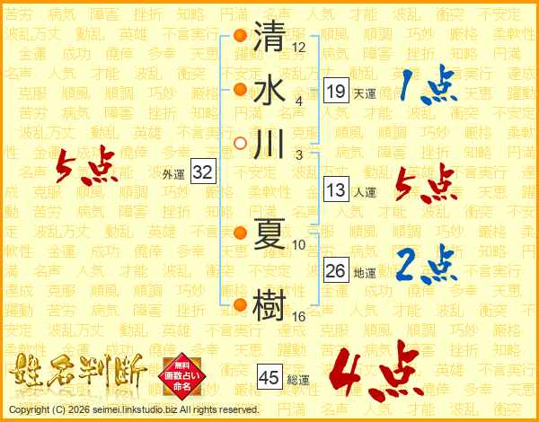 清(12画)水(4画)川(3画) 夏(10画)樹(16画)
