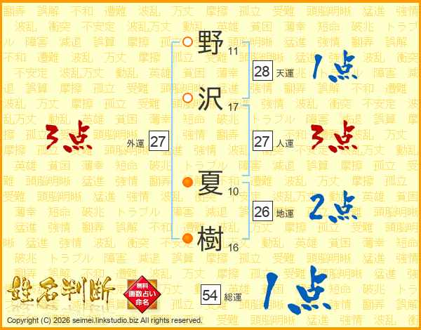 野(11画)沢(17画) 夏(10画)樹(16画)