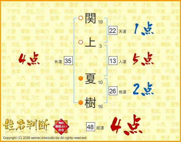 生活面を象徴する運勢です。外部から受ける影響力を表し、結婚運、家庭運や職場、環境への順応性を表します。総運から人運を引いた画数。姓や名が1文字の場合を除く。