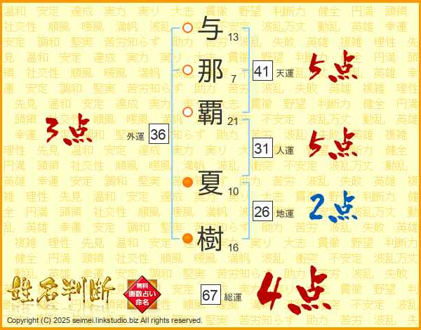与(13画)那(7画)覇(21画) 夏(10画)樹(16画)