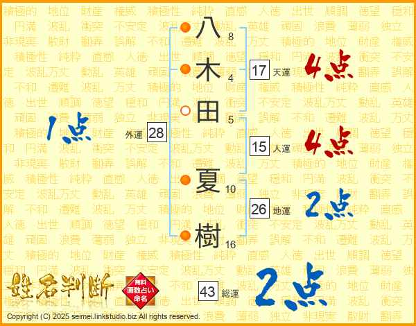八(8画)木(4画)田(5画) 夏(10画)樹(16画)