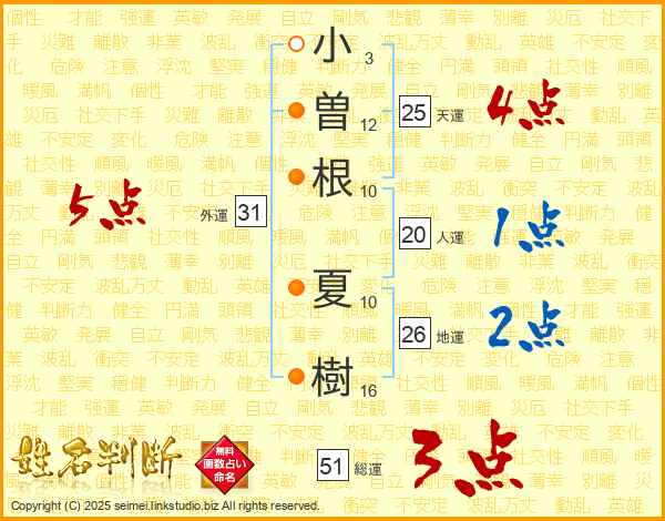 小(3画)曽(12画)根(10画)  夏(10画)樹(16画)