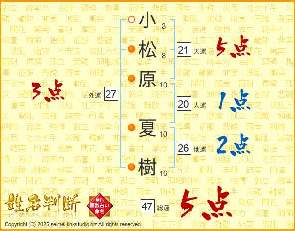 小(3画)松(8画)原(10画) 夏(10画)樹(16画)